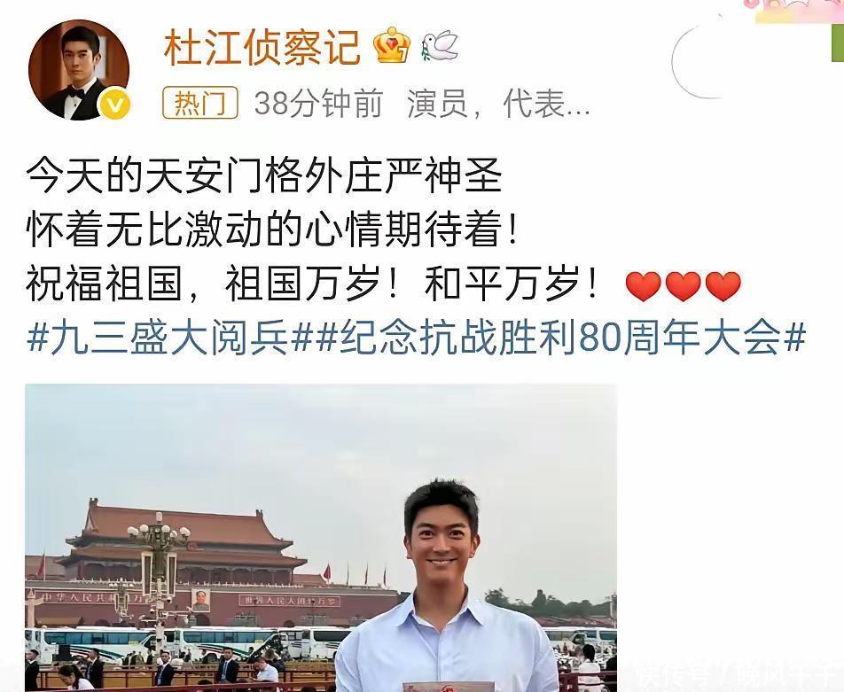杜江受邀插足九三大雠校,这真实是文娱圈少有的存在!国度认同级别的演员,这得是多大的光荣,霍想燕可欢笑坏了,有这么的老公太有排场了!