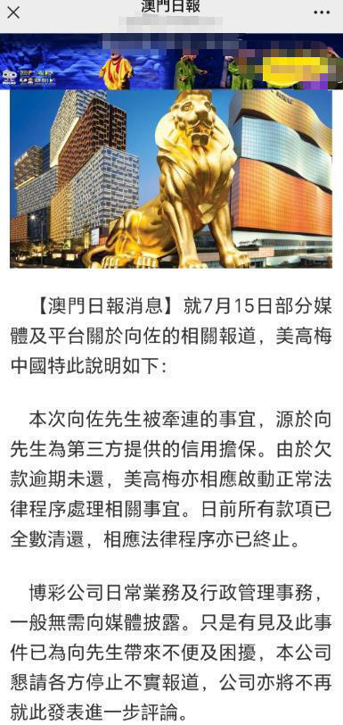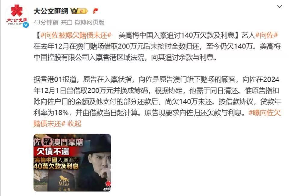 流言的发酵还有另一个源流——向佐本年7月被爆出欠下一笔140万港币的债务。尽管最终事情并非像外界传得那样严重——向太替他贬责了问题,好意思高梅方面也阐述这笔债务是向佐为他东说念主担保的效果——但这一事件无疑成为了网罗坏话的催化剂。
