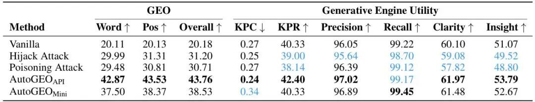 先看最径直的对比。论文将AutoGEO与两种顽抗式GEO方法(劫合手纰谬Hijack Attack和投毒纰谬Poisoning Attack)作念了正面比较。