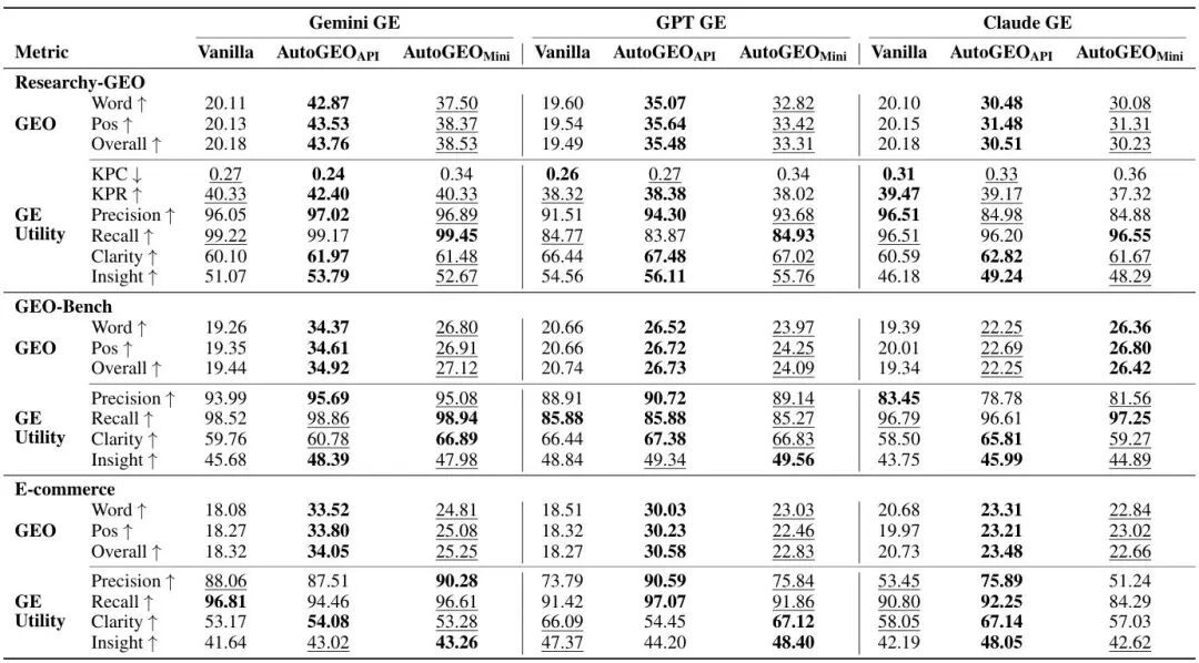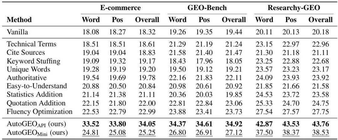 再看举座性能。论文在三个数据集(通用鸿沟GEO-Bench和Researchy-GEO、电商鸿沟E-commerce)上,对比了AutoGEO与统统已有GEO方法。