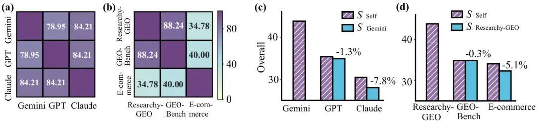 发现一:不同AI引擎的偏好大同小异。 相同数据集上,Gemini、GPT、Claude三个引擎的偏好规则重叠率在79%到84%之间。这意味着「好内容」的设施在不同AI引擎之间是重复的。